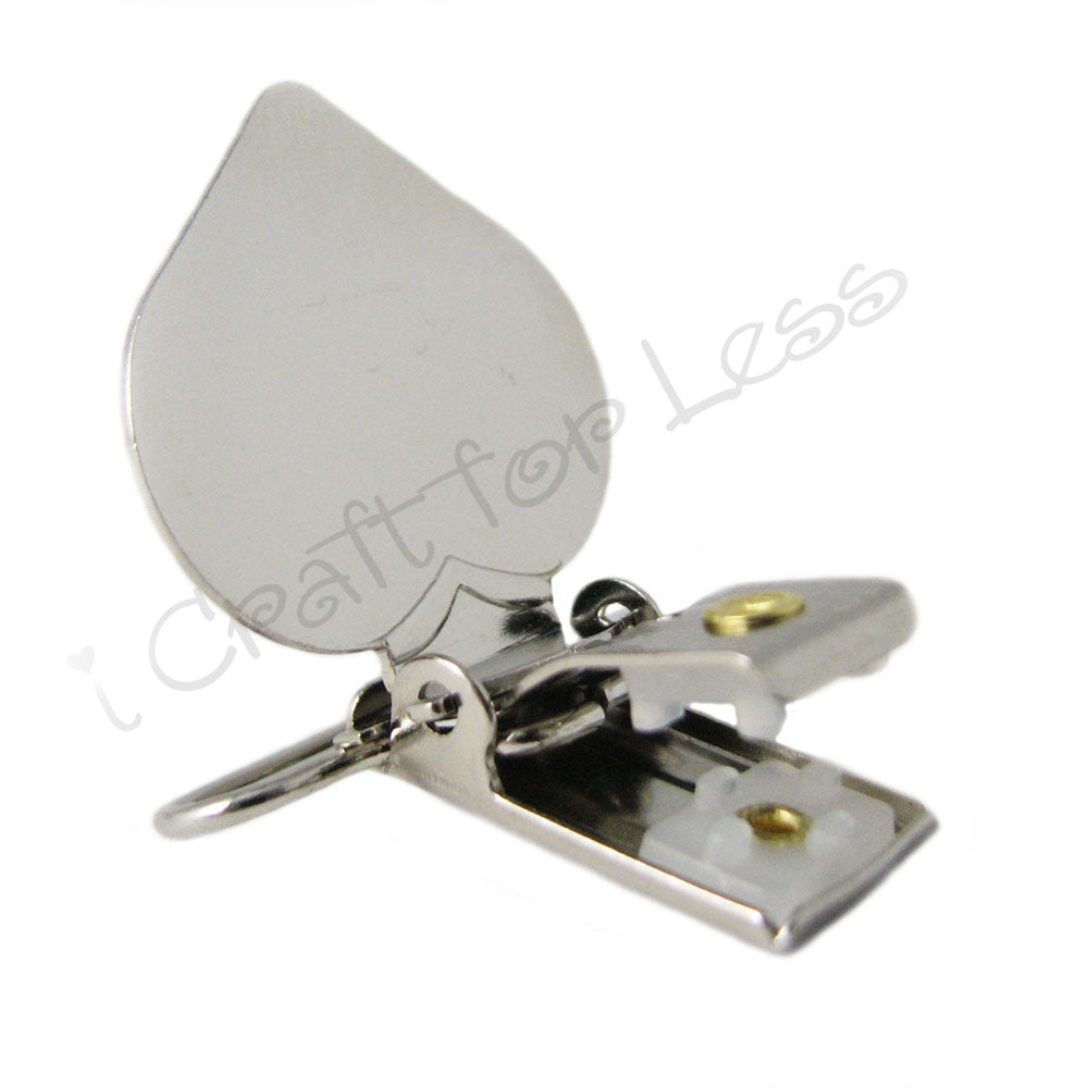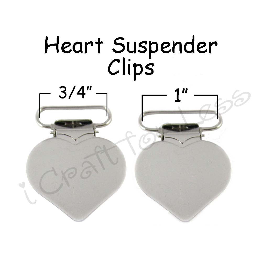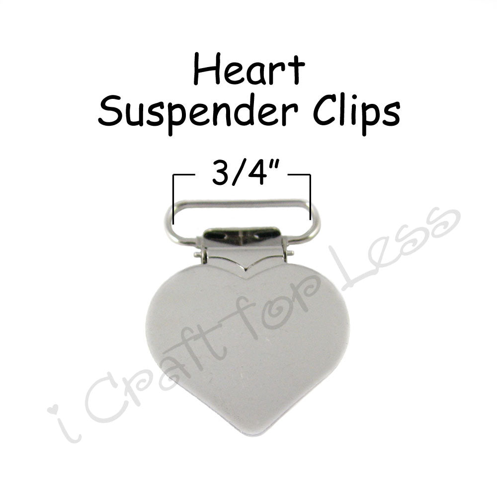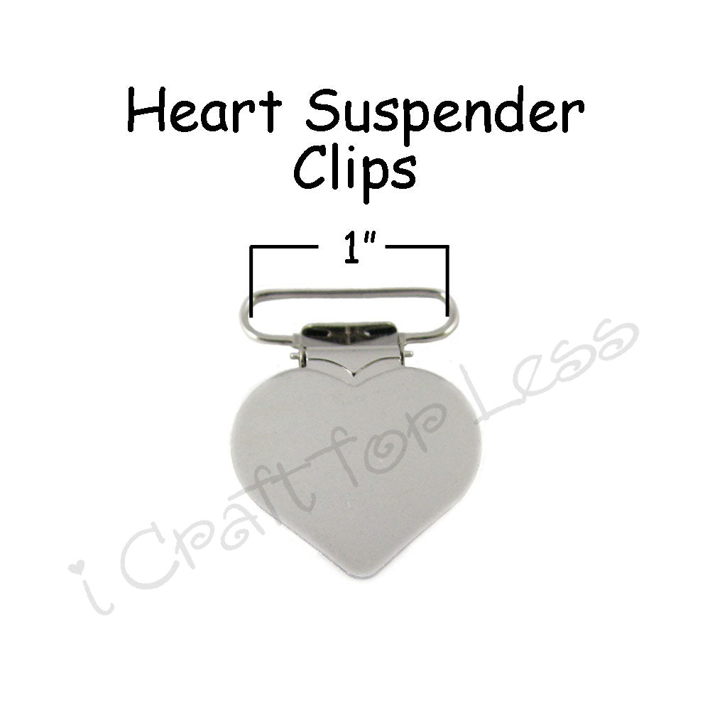 Heart shaped metal (nickel plated) suspender clips with rectangle plastic inserts that are perfect for making any of your pacifier holders, bib or mitten clips, toy holder and/or sewing or ribbon crafts.